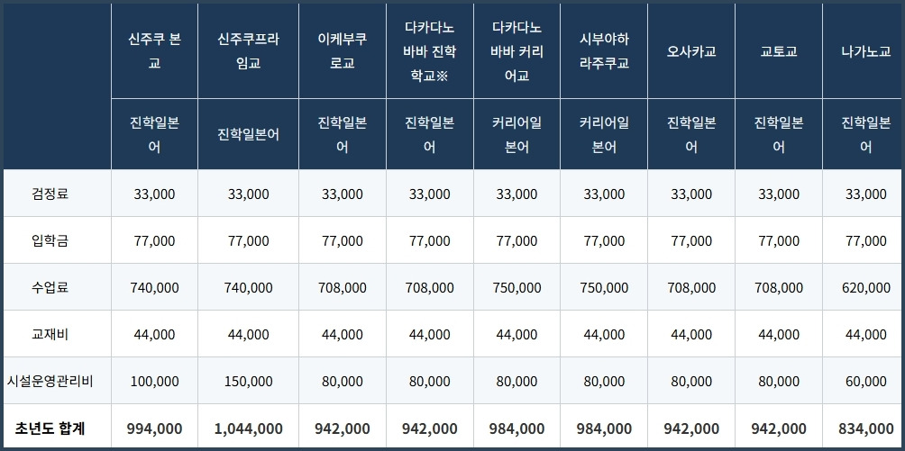 해당 캠퍼스: 신주쿠본교, 신주쿠프라임교, 다카다노바바교, 이케부쿠로교