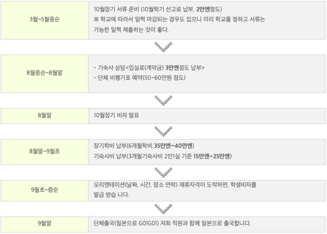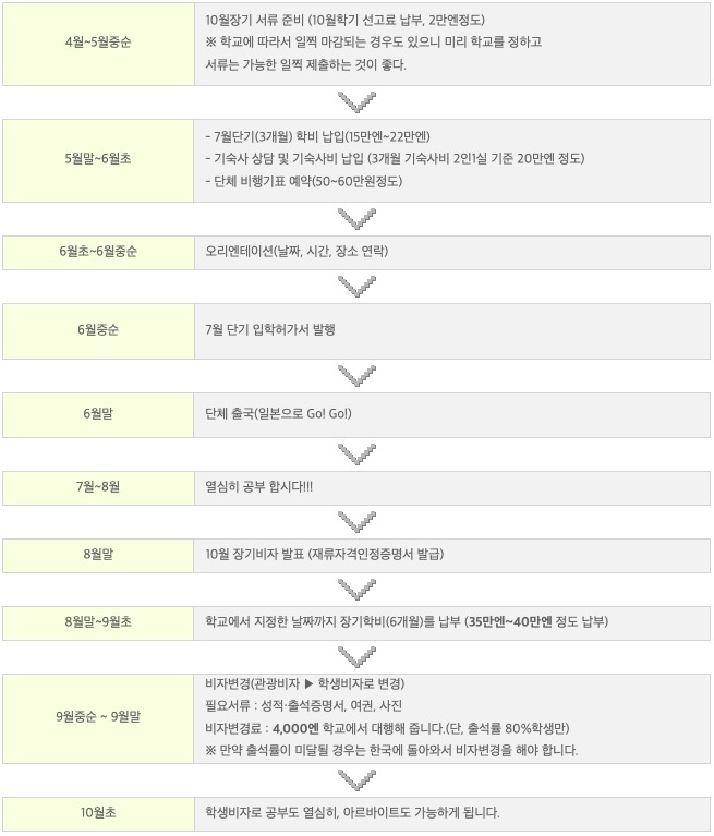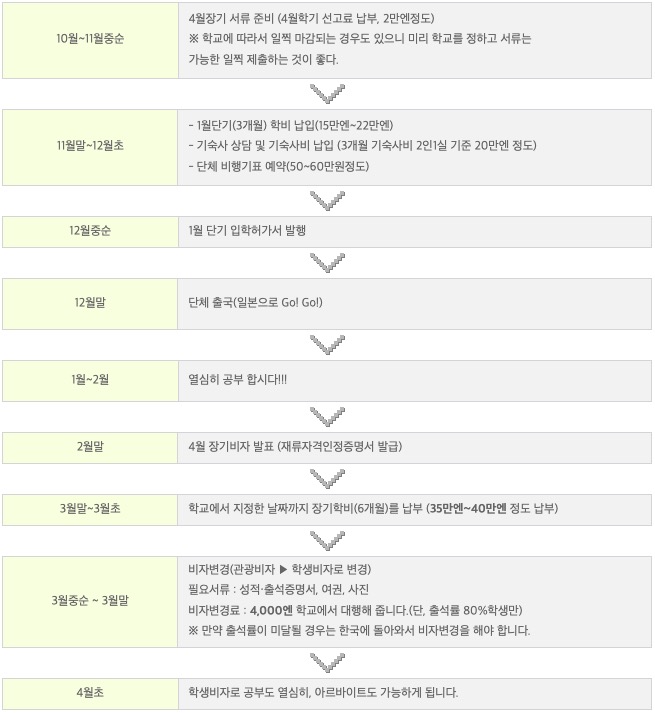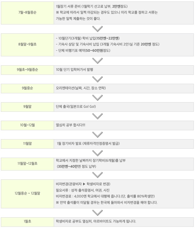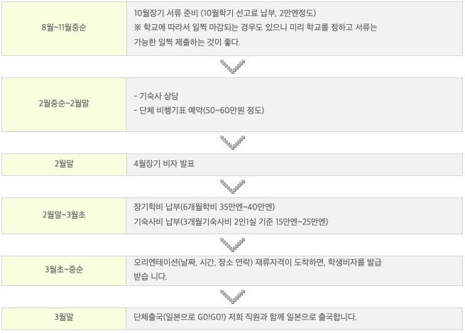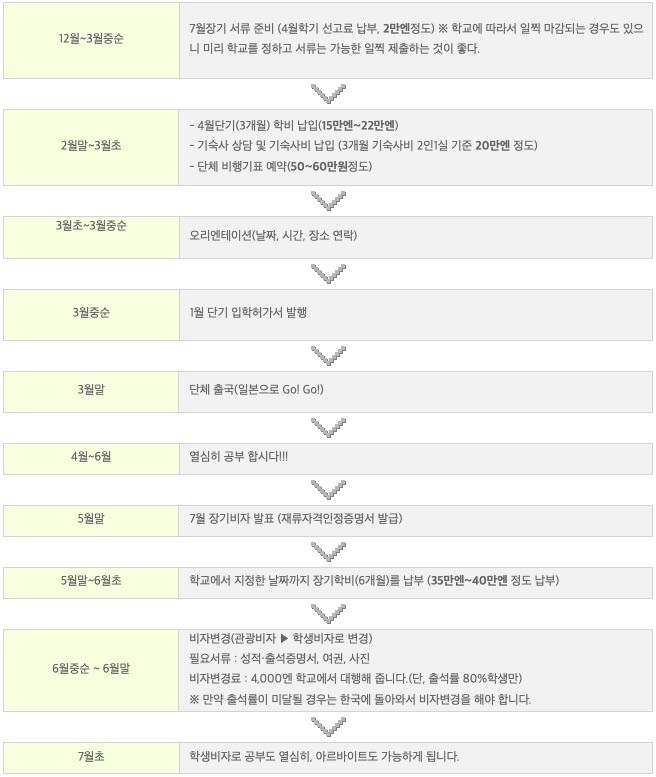 코스의 경우도 기간이 6개월에서 2년으로 다양하며, 재류자격은 유학 입니다. 대개 2부제 수업으로 1일 4시간 정도 수업이 이루어지는데 학기 (1월, 4월, 7월, 10월)선택이 자유롭고 학교의 수가 많아 일본 내에서 가장 발달한 일본 어학연수기관으로 뽑힙니다.